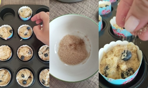 – Die Muffinförmchen zu etwa 2/3 füllen, die Oberfläche mit den zurückbehaltenen Blaubeeren und dem im Rezept vorgesehenen mit Zimt aromatisierten Rohrzucker dekorieren. Etwa 20/25 Minuten backen, immer die Stäbchenprobe machen.