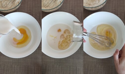 – In einer anderen Schüssel das Ei mit der Pflanzenmilch, dem Öl mischen und kurz mit dem Schneebesen verrühren.