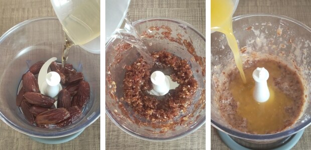 – Die Datteln mit Öl und Wasser pürieren, bis sie cremig sind, dann den Orangensaft hinzufügen und die Zutaten vermischen.