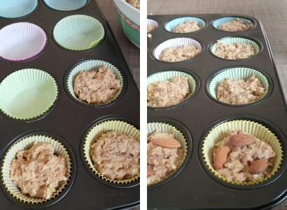 – Zwei Esslöffel Teig in jedes Muffinförmchen geben und die Oberfläche mit 3-4 ganzen Mandeln und den Mandelblättchen garnieren (falls verwendet).