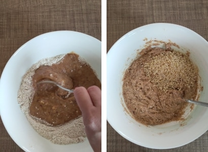 – Die Dattelpüree hinzufügen und nach dem Mischen den Mandelgrieß unterheben.