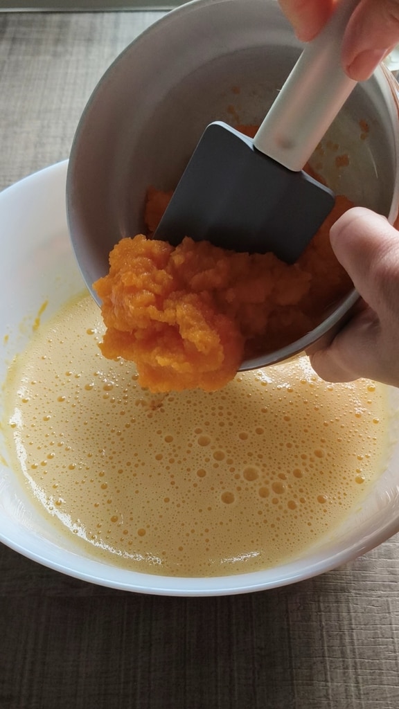 Das pürierte Kürbisfleisch hinzufügen und mischen.