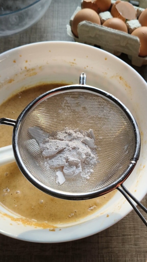 Das Backpulver direkt in den Teig sieben und dann die Hälfte des Teigs in eine saubere Schüssel gießen.