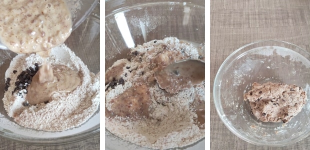 – Die Flüssigkeiten zum bereits gesiebten Vollkornmehl mit dem Backpulver, einer Prise Zimt und den Schokoladenstückchen hinzufügen.