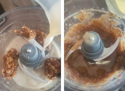 Die Datteln zerkleinern und dann immer noch im Behälter des Zerkleinerers das pflanzliche Getränk und das Öl hinzufügen.