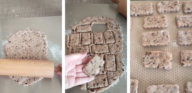 – Den Teig zusammenfügen, dann auf der Arbeitsfläche ausrollen und mit den Ausstechformen ausstechen. Die Kekse auf ein mit Backpapier oder einem mikroperforierten Backmatte ausgelegtes Backblech legen.