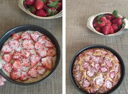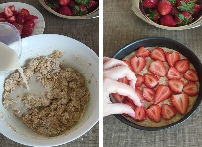 – Zur Mischung, die anfangs etwas schwer zu bearbeiten ist (aufgrund des Vollkornmehls, das viel aufnimmt), die Milch hinzufügen und verrühren. Den Teig in die leicht gefettete Form geben und die Oberfläche mit den Erdbeeren dekorieren.