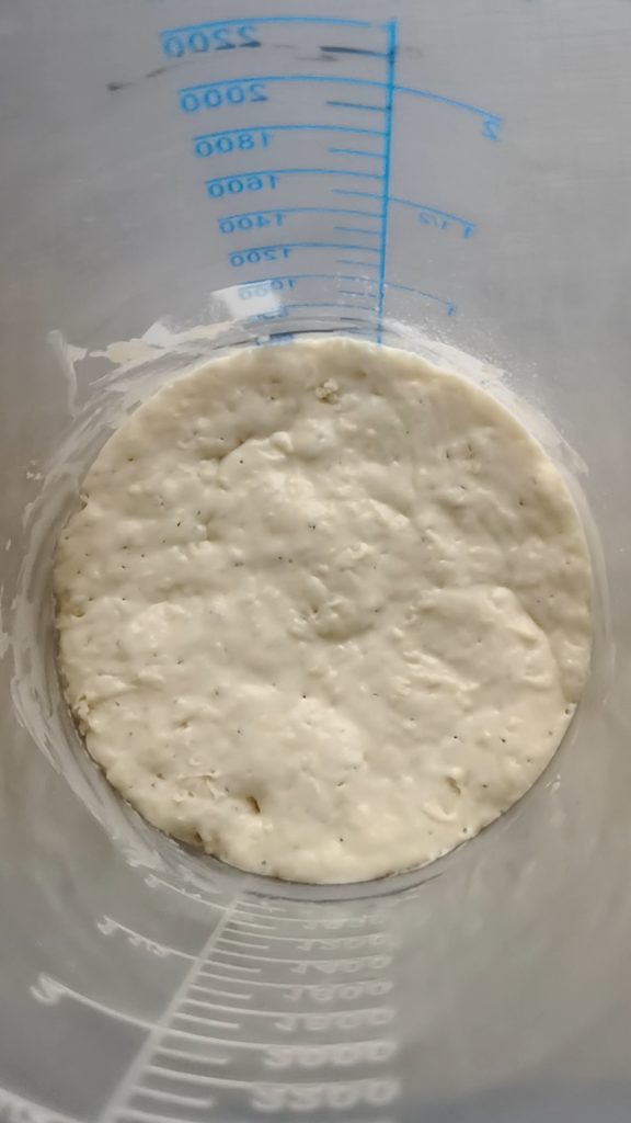 Die zerbröckelte Hefe in den Messbecher geben und in leicht warmer (oder Raumtemperatur-kalter) Milch auflösen, das Mehl und einen Teelöffel Zucker von den Gesamtzutaten hinzufügen. Mischen und bei 20/22°C zugedeckt reifen lassen (suchen Sie einen kühlen Ort im Haus, wenn Ihre Küche zu warm ist) für etwa 12/14 Stunden. Es sollte leicht zusammenfallen wie auf dem Foto. Berechnen Sie die Zeit, je nachdem, wann Sie am Morgen mit dem Teig beginnen möchten.