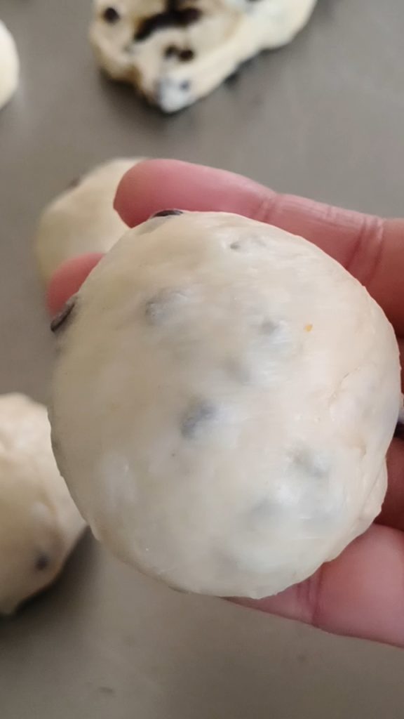 Legen Sie die Kugeln auf ein mit Backpapier ausgelegtes Backblech und, wenn gewünscht, können Sie ein paar Schokoladentropfen auf der Oberfläche der Kugeln verteilen.