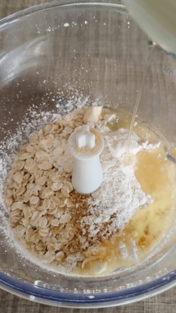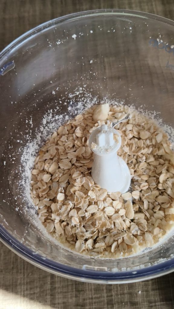 Die Mandeln in den Zerkleinerer geben und ein paar Sekunden lang zerkleinern, ohne sie zu Pulver zu machen, dann die Haferflocken hinzufügen.