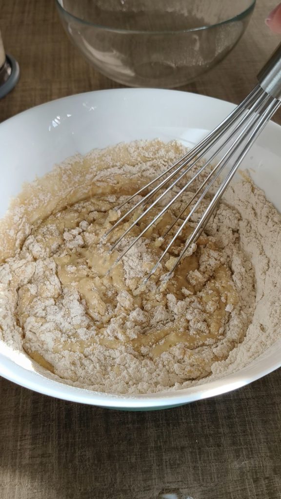 Mit einem Schneebesen ein paar Minuten lang mischen, dann das Pflanzengetränk und das Öl hinzufügen und mit dem Schneebesen mischen.