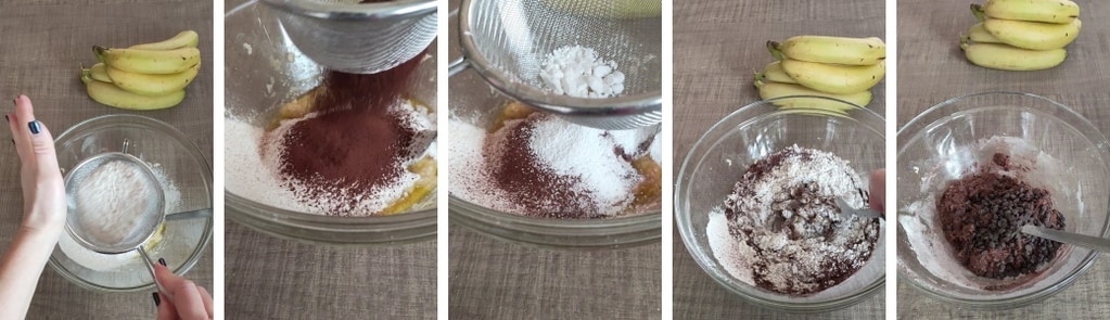 – Sieben Sie direkt in die Schüssel das Mehl, Kakao und Backpulver, dann mischen und anschließend die Schokoladensplitter hinzufügen.