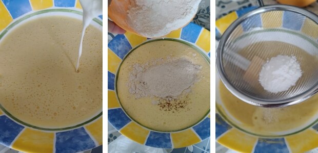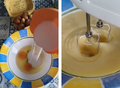 – In einer Schüssel die Eier mit dem Zucker mit einem elektrischen Mixer aufschlagen (der Teig sollte hell werden).