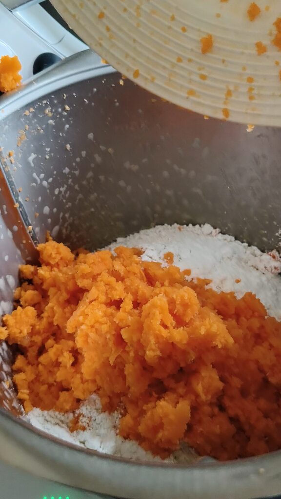 Die Karotten hinzufügen, den Deckel mit Messbecher schließen und bei Geschwindigkeit 4 für 20 Sekunden mischen, dann mit dem Spatel, schließen und weitere 10 Sekunden immer bei Geschwindigkeit 4 mischen.