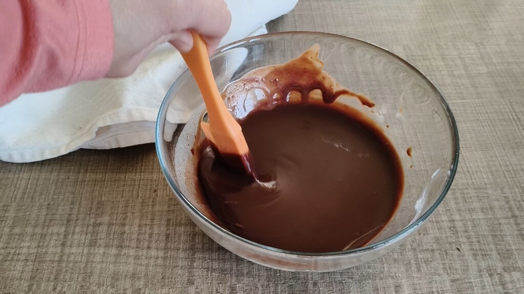 Um den Kuchen köstlich und weihnachtlich zu machen, wird eine Ganache aus dunkler Schokolade und Zimt verwendet; auch dieser Schritt ist recht einfach, da die fast kochende Sahne über die gehackte Schokolade gegossen wird.