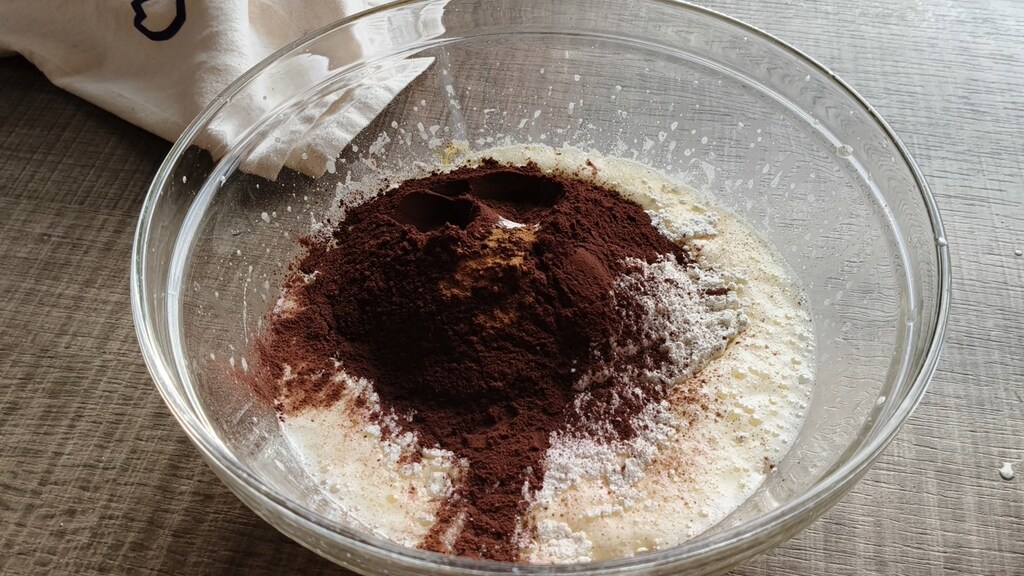 Das Mehl sieben, um Verunreinigungen zu entfernen, und zusammen mit dem Backpulver, Kakao und Zimt zum Teig geben.