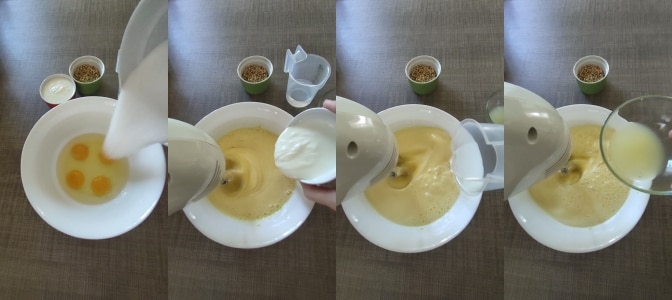 – Eier und Zucker mit dem elektrischen Mixer schlagen, dann den Joghurt, das Wasser und den Zitronensaft unter Rühren bei niedriger Geschwindigkeit hinzufügen.