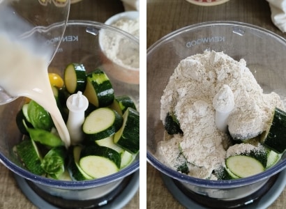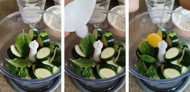 – Zucchini waschen, die Enden abschneiden und in Scheiben oder Stücke schneiden. Dann zusammen mit Basilikum, Salz und Ei in den Becher der Küchenmaschine geben.