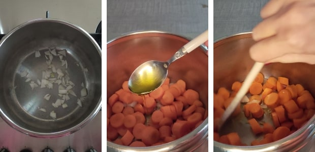 – In den Schnellkochtopf die grob gehackte halbe Zwiebel und die Karotten geben; 2 Esslöffel Öl hinzufügen und leicht anbraten, dabei umrühren.