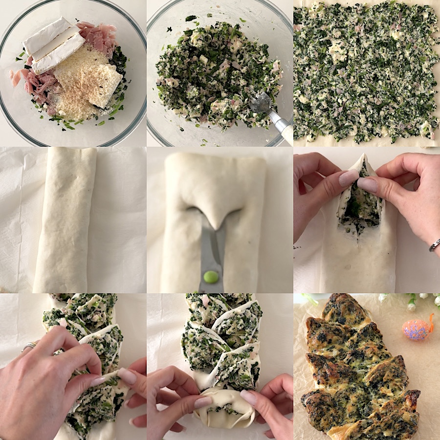 Die rustikale Blätterteigähre ist ein schnelles und einfaches herzhaftes Gebäck in Form einer Ähre (oder auch Palme/Palmette), perfekt als Vorspeise für den Palmsonntag oder als Vorspeise für Ostern und Ostermontag. Ich habe sie mit Spinat, gekochtem Schinken und Brie gefüllt, aber natürlich könnt ihr die Füllung nach eurem Geschmack wählen, in jedem Fall wird sie schnell vergriffen sein, und sie ist so hübsch, dass ihr sie auch als Tischdekoration verwenden könnt. Um die Form zu erstellen, benötigt ihr keine speziellen Formen oder Ausstecher, nur ein Paar Scheren!