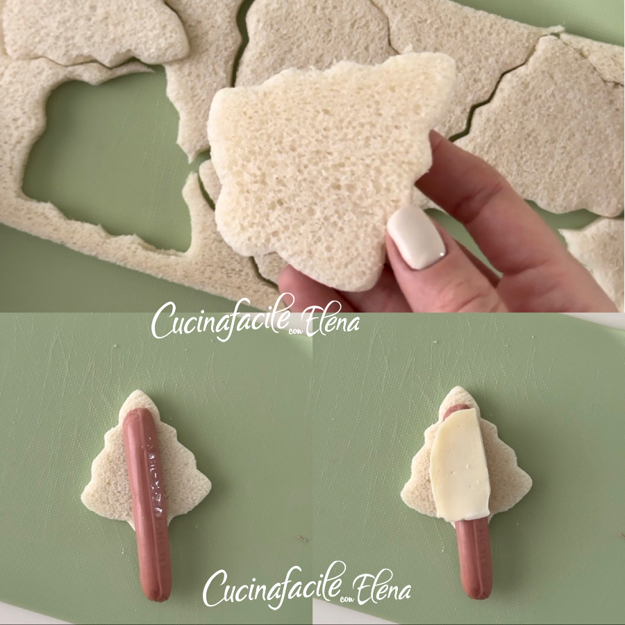 Verfahren Sie auf diese Weise, um alle Brottannenbäume für Sandwiches zu erstellen. Legen Sie sie auf ein mit Backpapier ausgelegtes Backblech und backen Sie sie im vorgeheizten Ofen bei 180 Grad für 10 Minuten.