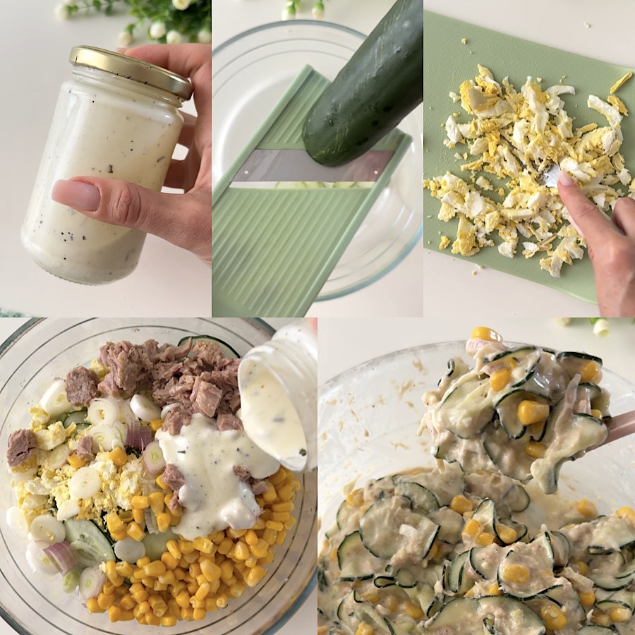 Die Eier abkühlen lassen, schälen und mit einer Gabel zerdrücken. Die Gurke putzen und in sehr dünne Scheiben schneiden (verwenden Sie eine Mandoline, wenn Sie eine haben), in eine Schüssel geben, die Eier, die Schalotte in kleine Stücke, den gut abgetropften Mais, den abgetropften Thunfisch, das zuvor zubereitete Dressing hinzufügen und gut mischen, damit sich alle Zutaten gut verbinden.