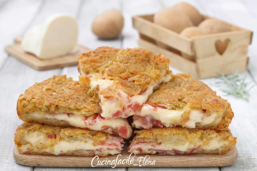 Die im Ofen gebackene geriebene Kartoffelpizza ist ein super leckeres und sehr schnelles Rezept. Meine Speisekammer und der Kühlschrank waren fast leer und ich wusste nicht, was ich zum Abendessen zubereiten sollte, also nahm ich die 4 Kartoffeln, die ich hatte, ein paar Scheiben Coppa und etwas Käse und machte dieses köstliche Fladenbrot, das nicht in der Pfanne, sondern im Ofen gebacken wurde (oder im Heißluftfritteuse). Zerläuft, innen weich und außen knusprig, ist die geriebene Kartoffelpizza wirklich fantastisch, einfach und sehr schmackhaft, ohne Eier, einfach alles zusammenfügen und ab in den Ofen, sie eignet sich perfekt als Vorspeise, Hauptgericht oder als Einzelgericht, ohne Wurst für eine vegetarische Version, ihr müsst sie unbedingt probieren, sie wird im Handumdrehen verschwinden!