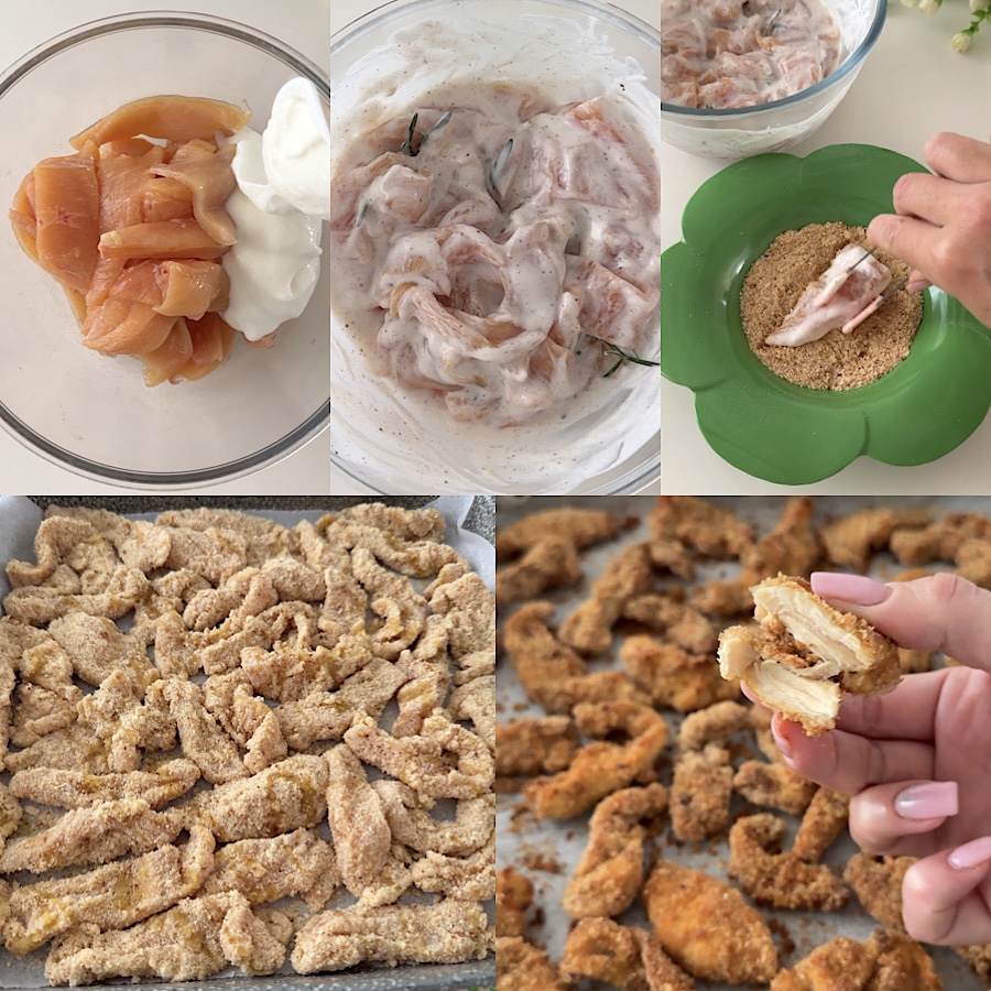 Nachdem Sie es „mariniert“ haben, nehmen Sie das Hähnchen heraus und wenden jedes Stück im Paniermehl. Legen Sie die panierten Hähnchenstreifen mit Joghurt auf ein mit Backpapier ausgelegtes Backblech, träufeln Sie etwas Öl darüber und backen Sie sie in einem vorgeheizten Ofen bei 200 Grad für etwa 20 Minuten, bis sie goldbraun sind.