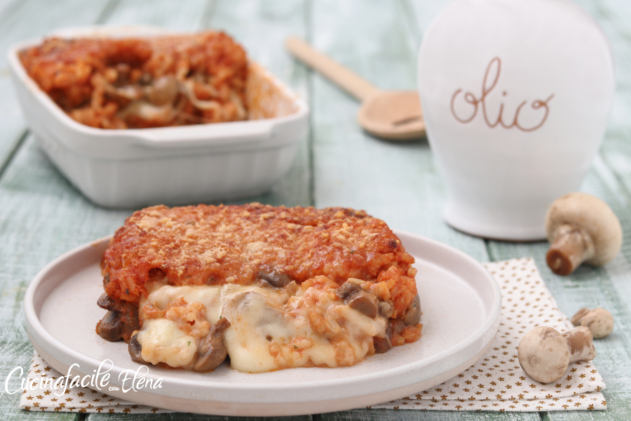 Der im Ofen gebackene Reis mit Pilzen ist ein wirklich köstliches Hauptgericht. Ich liebe im Ofen gebackenen Reis generell, und dies ist eines der Rezepte, die ich am häufigsten mache. Ich koche den Reis wie bei uns in Sizilien für Arancine (so wird der Reis schmackhaft, nicht matschig, und er kocht praktisch von selbst ohne dass wir Eier hinzufügen müssen), würze ihn mit Tomatensoße (man kann es auch in der „weißen“ Version mit Safran machen), und ab in den Ofen! Der im Ofen gebackene Reis mit Pilzen ist ohne Eier und ohne Butter, köstlich, super dehnbar und cremig, wird sowohl bei Erwachsenen als auch bei Kindern sehr beliebt sein und ist perfekt sowohl für das tägliche Mittagessen als auch für einen besonderen Sonntag oder einen Feiertag (auch für Weihnachten, fangen wir schon mal an zu überlegen :D)!