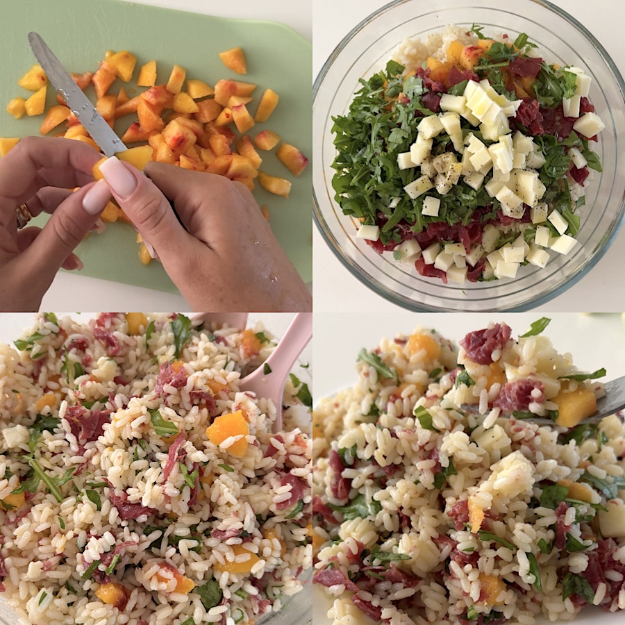 Der Reissalat mit Pfirsichen und Bresaola mit Rucola und Asiago ist ein schnelles und sehr leckeres kaltes Sommergericht, ein frisches und köstliches Gericht, das in wenigen Minuten zubereitet ist. Ich liebe salzige Kombinationen mit Obst, und ich habe beschlossen, dieses einzigartige Gericht zum Mittagessen zuzubereiten und es war buchstäblich ein Hit, wir haben es alle genossen, sogar die Kinder, sie haben es geliebt! Der Reissalat mit Pfirsichen und Bresaola ist perfekt, um ihn mit ans Meer, an den Strand, in den Park oder ins Büro zu nehmen, auch ideal für ein Buffet oder einen Aperitif, er wird Sie beim ersten Bissen erobern!