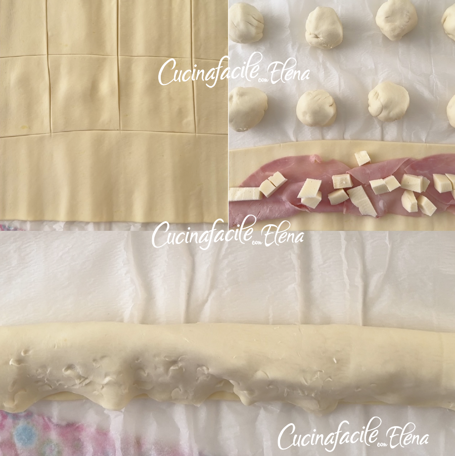 • Füllen Sie die kleinen Stücke mit etwas gekochtem Schinken und Käse, schließen Sie sie und formen Sie kleine Bällchen wie die vorherigen. Füllen Sie auch den ganzen Streifen und falten Sie ihn in der Mitte, wobei Sie die Ränder gut verschließen.
