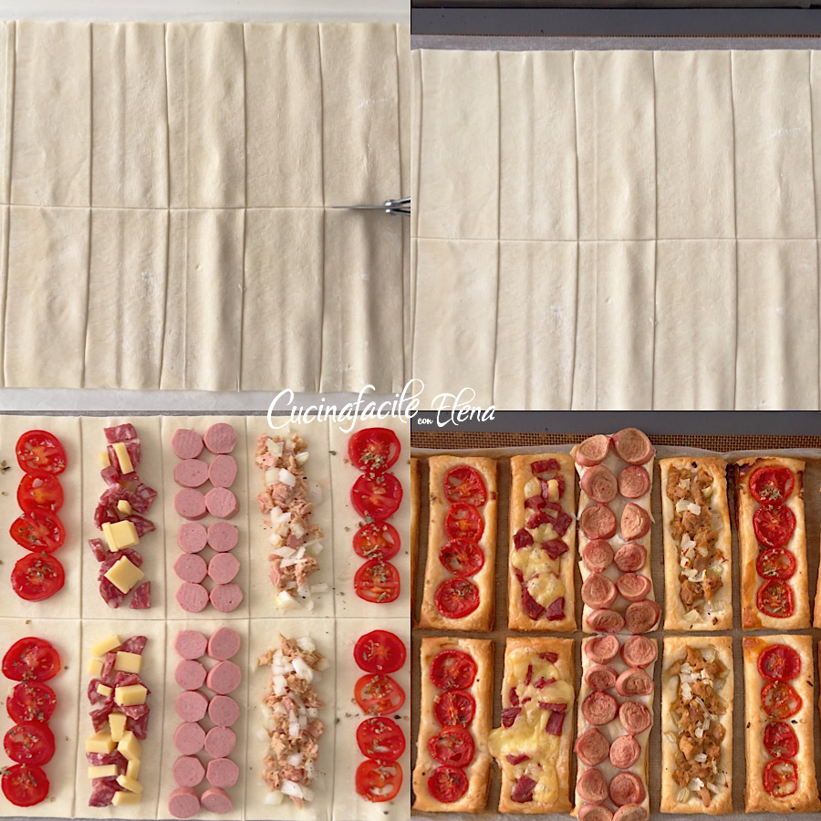 Die Blätterteigstücke auf ein Backblech mit Backpapier legen und die salzigen Blätterteigstangen belegen: auf 4 Stücken die in dünne Scheiben geschnittenen Kirschtomaten, Salz und Oregano verteilen, weitere 4 mit Salami und klein geschnittenem Käse belegen, weitere 4 mit in Scheiben geschnittenen Würstchen und auf den letzten 4 abgetropften Thunfisch, gehackte Zwiebel, schwarzen Pfeffer und Salz geben.