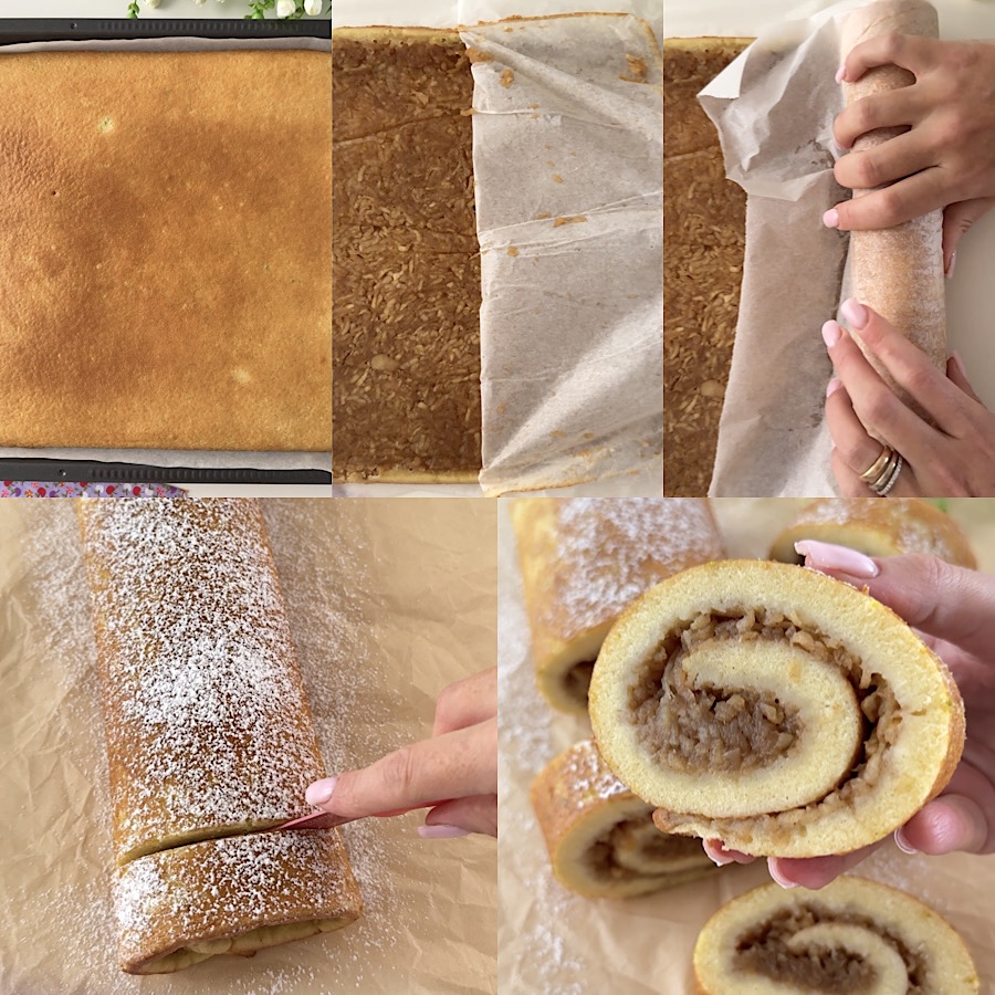 • Nehmen Sie den Kuchen aus dem Ofen, legen Sie ein Blatt Backpapier und ein Gitter darauf und drehen Sie ihn um. Nach dem Herausnehmen sofort noch warm aufrollen, dabei das darunterliegende Backpapier zur Hilfe nehmen.