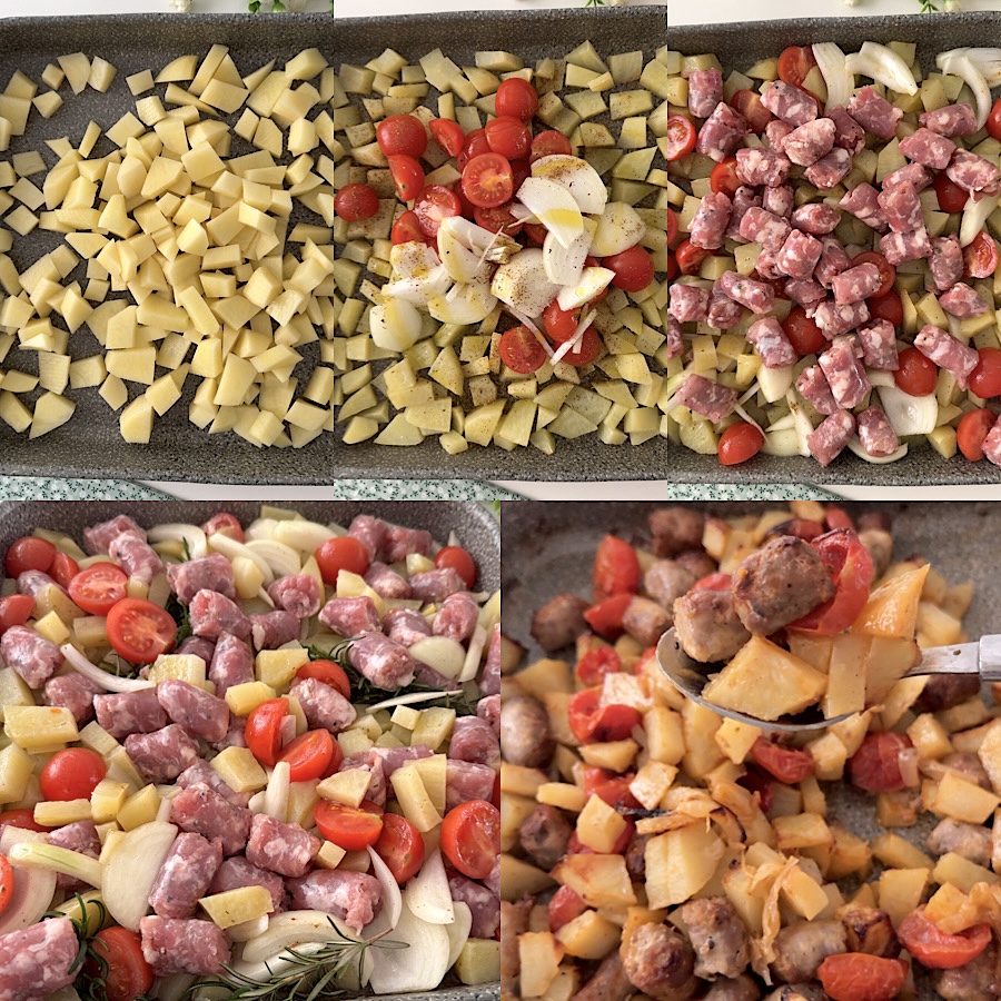 • Die Kartoffeln aus dem Ofen nehmen und die halbierten Kirschtomaten, die gehackte Zwiebel, Salz, Pfeffer und Gewürze nach Belieben hinzufügen (ich habe Rosmarin, Oregano und Thymian verwendet), sowie weitere zwei Esslöffel Öl und gut umrühren.