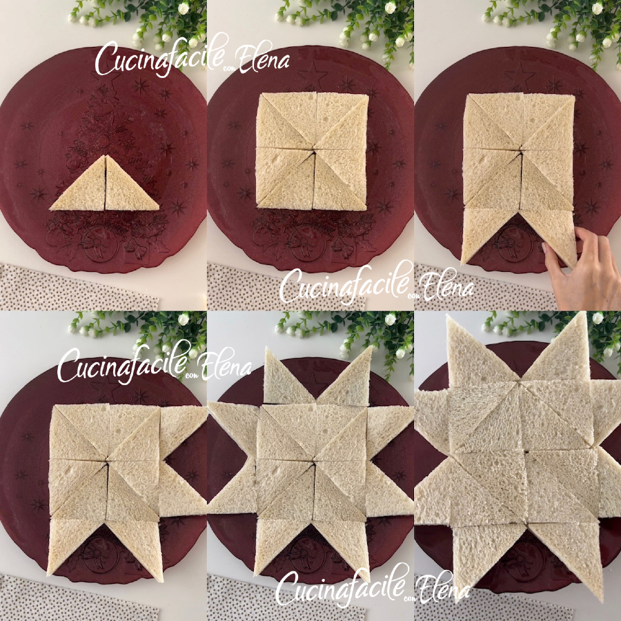 ● Jetzt sind wir bereit, unseren Stern aus Sandwiches zusammenzusetzen, der aus 3 gleichen Schichten besteht. Nachdem die erste fertiggestellt ist, ist es ganz einfach, ihn zu vollenden.