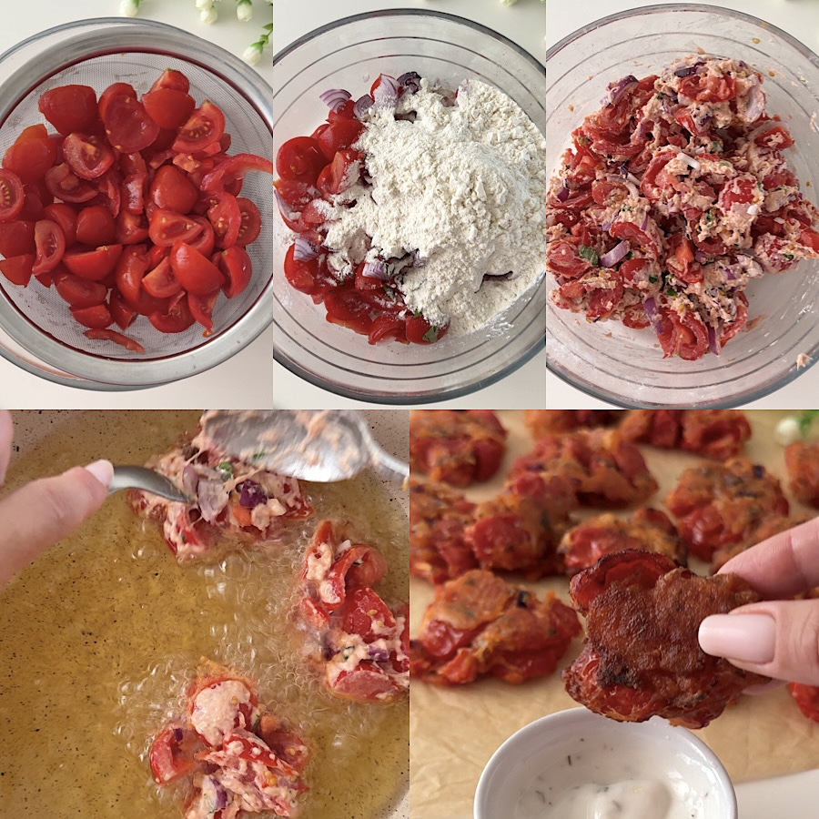 Wenn Sie Zeit haben, lassen Sie alles eine halbe Stunde ruhen, damit der Teig cremiger wird und die Tomaten perfekt umhüllt. Wenn Sie möchten, dass man mehr von der Tomate als vom Teig schmeckt, machen Sie die Tomatenpfannkuchen sofort.
