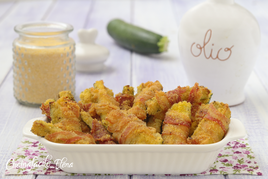 • Die Zucchini in eine Schüssel geben und mit extra nativem Olivenöl, Salz und schwarzem Pfeffer würzen. Gewürze nach Belieben hinzufügen (ich habe Knoblauchpulver, Oregano und Rosmarin genommen), Maismehl hinzugeben und alles gut vermischen. Ein Stück Zucchini nehmen und in etwas Speck einwickeln, auf diese Weise alle Zucchinistücke mit Speck herstellen.