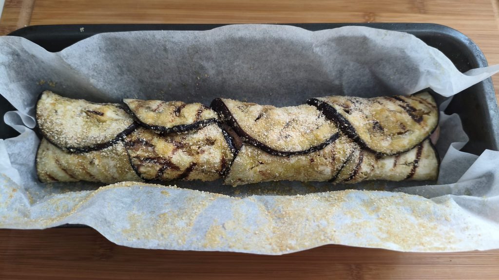• Ein Blatt Backpapier auf die Arbeitsfläche legen, ein wenig Öl darauf träufeln und mit Semmelbrösel bestreuen. Die gegrillten Auberginenscheiben nebeneinander und leicht überlappend anordnen. Salzen und den gekochten Schinken sowie die Scheiben von geräuchertem Scamorza hinzufügen.