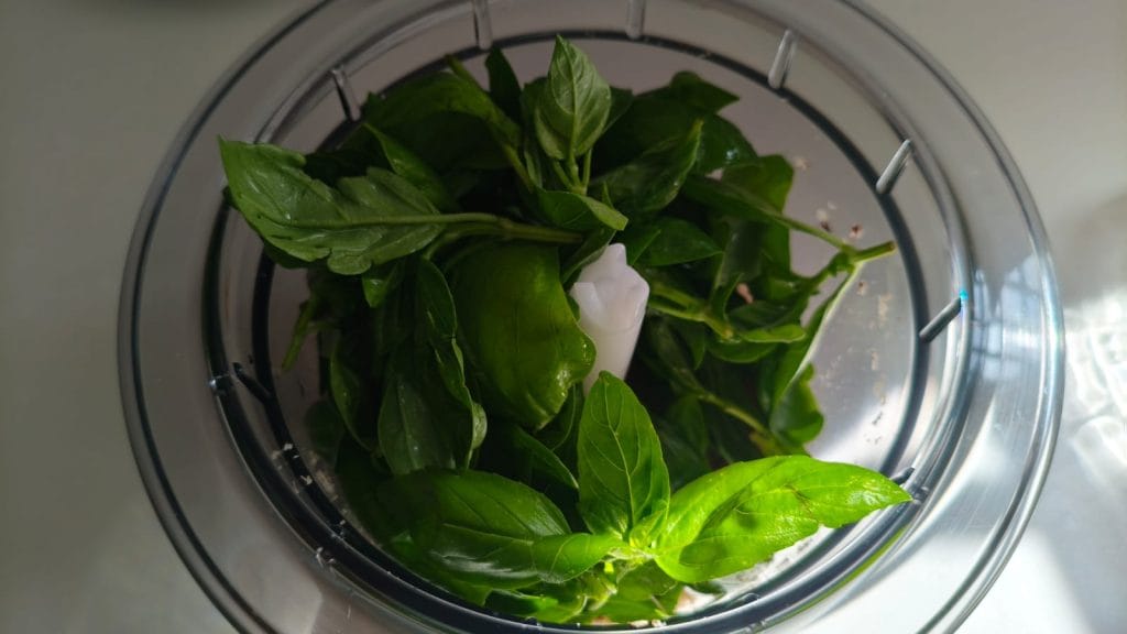Die Basilikumblätter zur zerkleinerten Mischung hinzufügen und einige Sekunden mixen, dann das extra native Olivenöl hinzufügen.