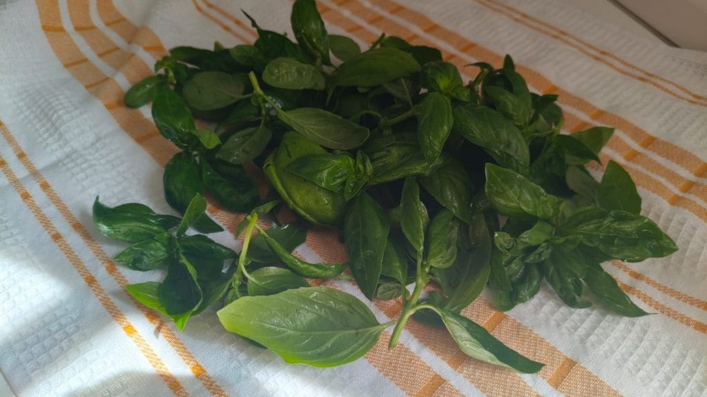 Das Basilikum-Haselnuss-Pesto ist auch eine großartige Idee, um das frische Basilikum vom Balkon zu verwenden, bevor es verwelkt.