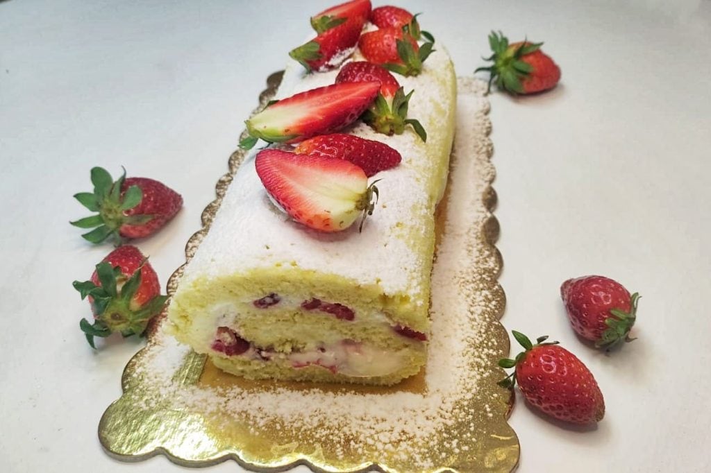 Die Biskuitrolle mit Creme und Erdbeeren ist ein zeitloses Dessert, das Einfachheit, Geschmack und einen Hauch von Eleganz vereint. Perfekt für jede Gelegenheit besticht dieses Dessert durch seinen weichen Biskuitboden, der um eine samtige Creme gewickelt und mit dem frischen und unverkennbaren Geschmack von Erdbeeren angereichert wird.