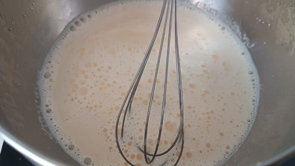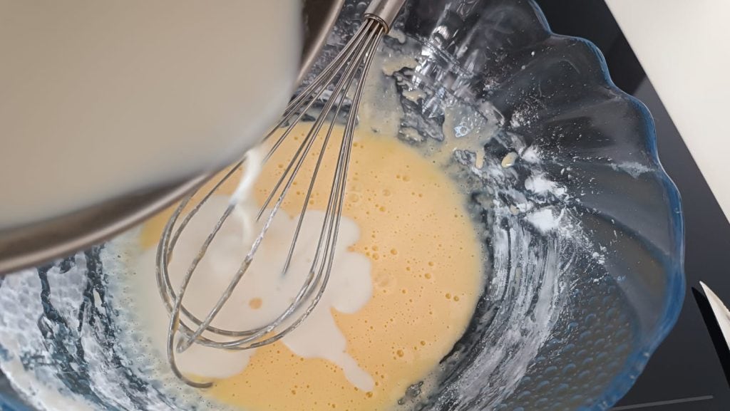 • sobald sie heiß ist, die Hälfte zur Eiermischung geben und mischen.