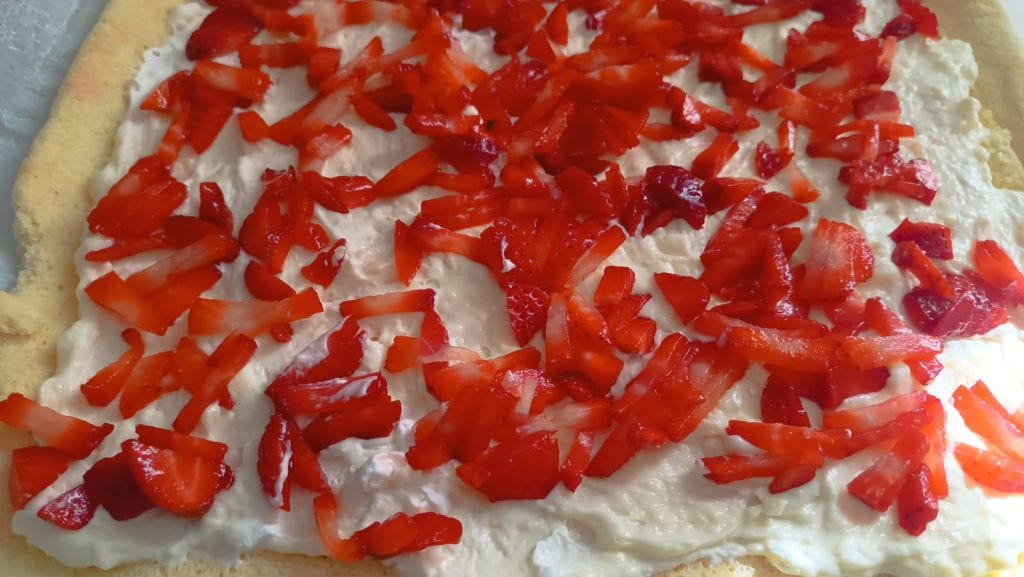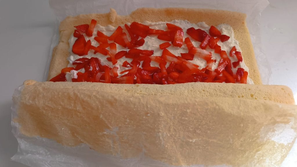 • Den Biskuit entrollen, die Creme und die Erdbeeren darauf verteilen, die Ränder frei lassen.