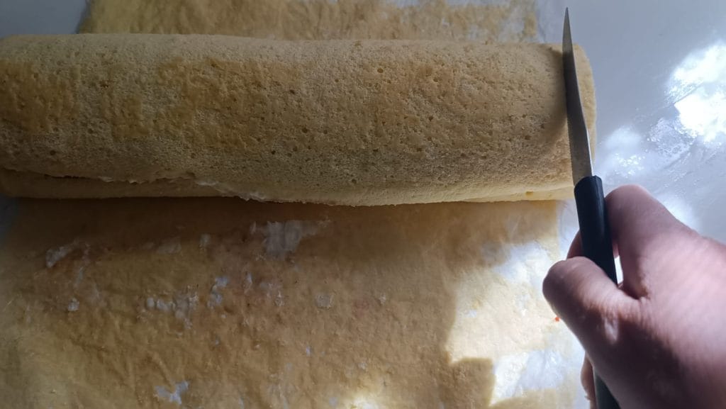 • Die Enden des Rollos abschneiden. Mit Frischhaltefolie abdecken und 2 Stunden im Kühlschrank aufbewahren.