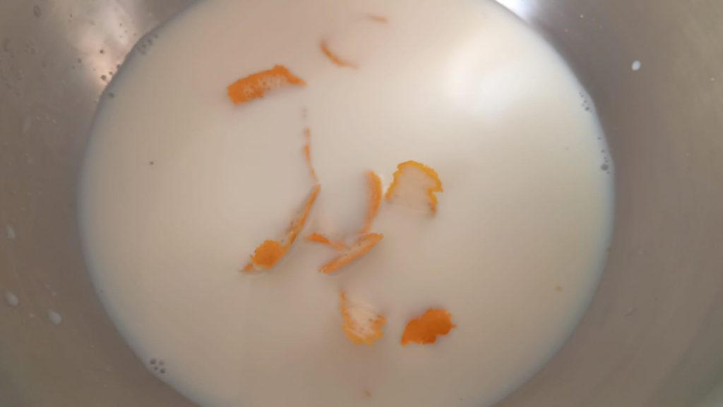 • In einem Topf die Milch mit der Zitronenschale erwärmen