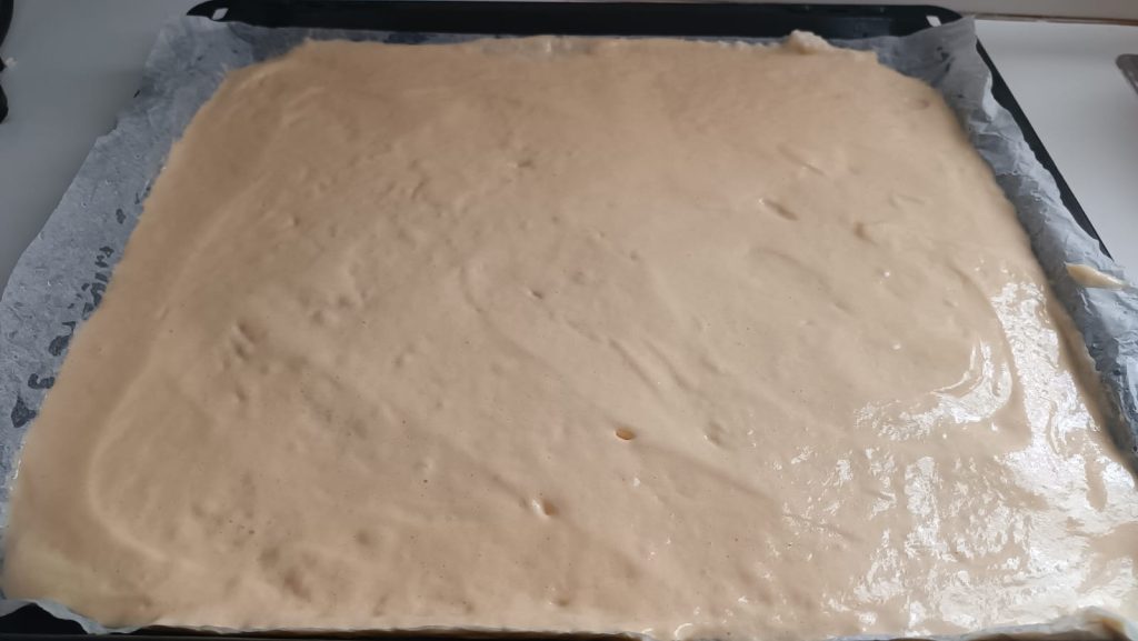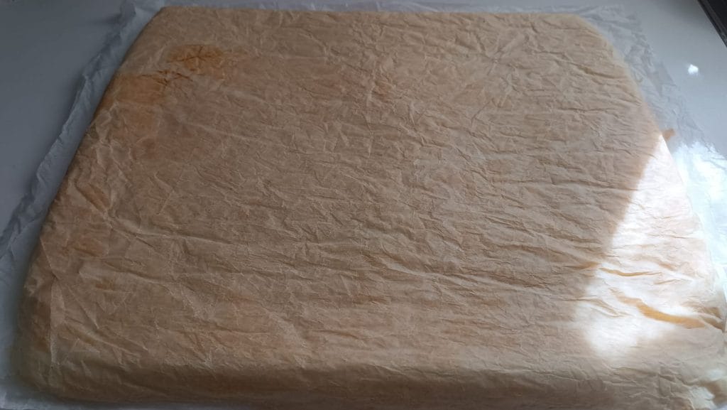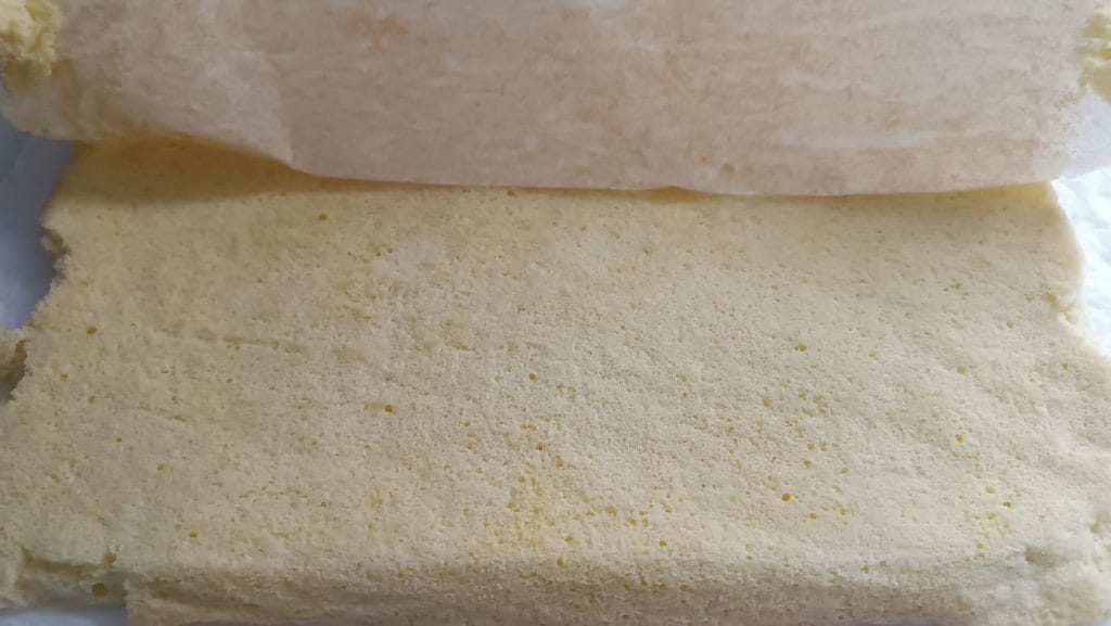 • Nach dem Backen den Biskuit auf eine Arbeitsfläche mit einem weiteren nassen und ausgewrungenen Backpapier umdrehen