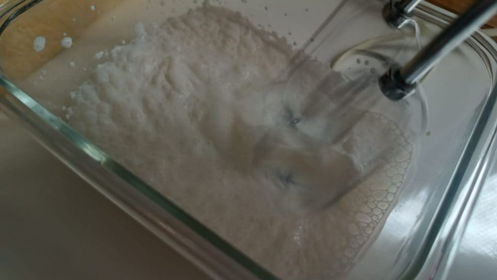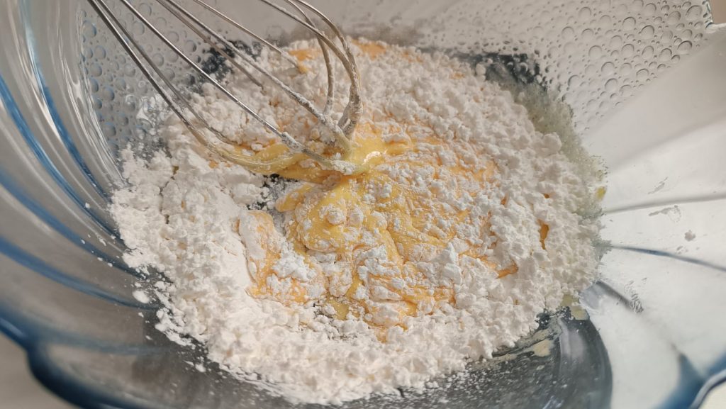 • Die Kartoffelstärke hinzufügen und gut mischen, um Klumpenbildung zu vermeiden.