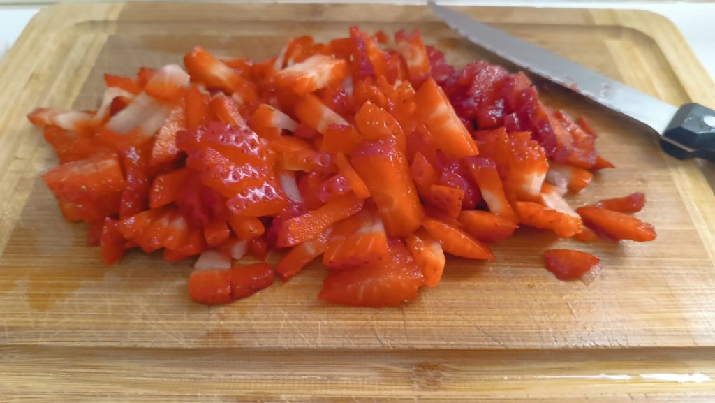 • Die Erdbeeren waschen und fein schneiden, einige zur Dekoration beiseitelegen.