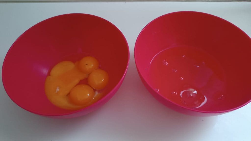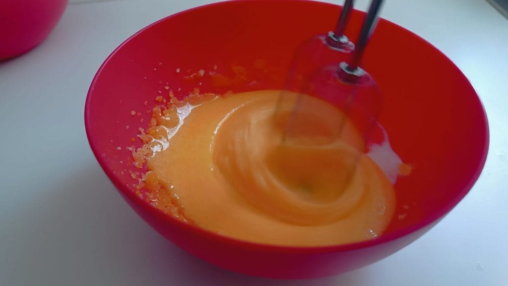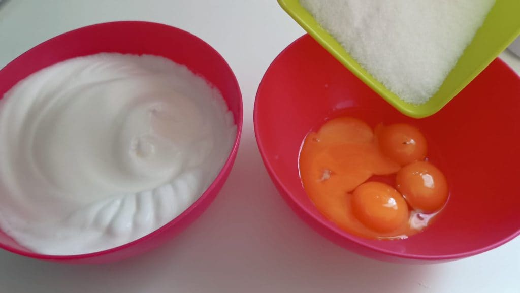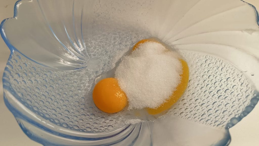 • In der Zwischenzeit die Creme vorbereiten, indem Sie den Zucker zu den Eigelben geben und sie mit einem Schneebesen schlagen.