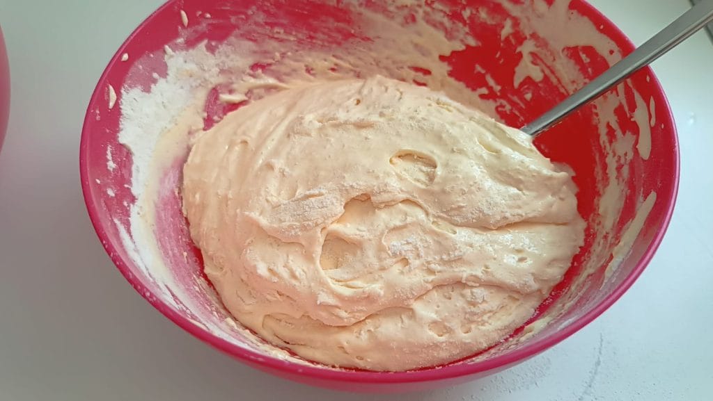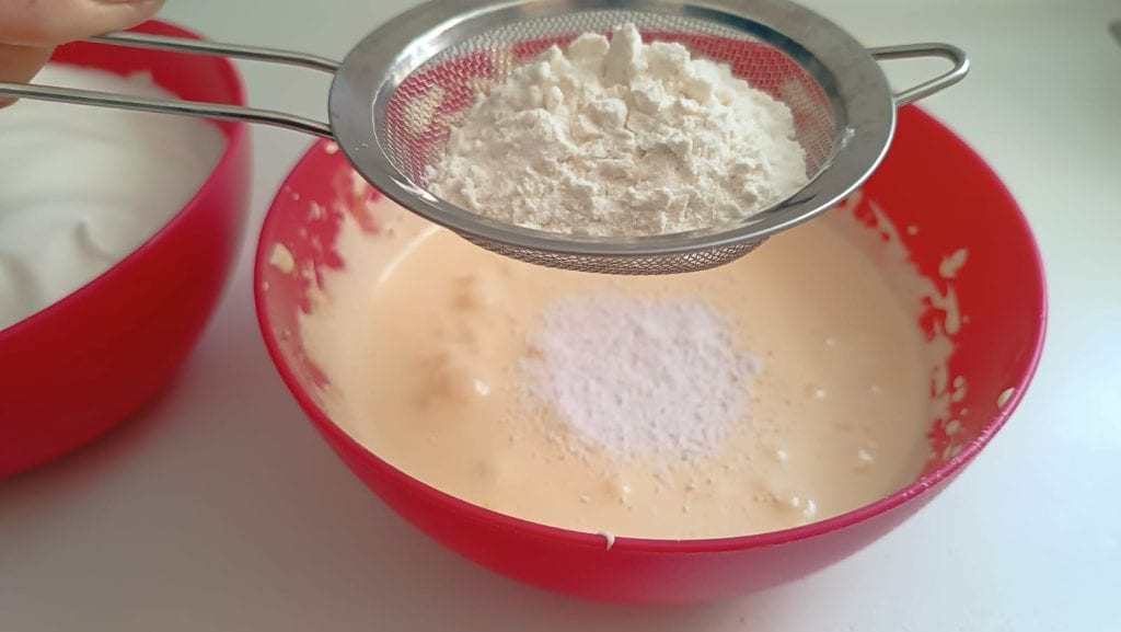 • Fügen Sie dann das gesiebte Backpulver und Mehl hinzu.